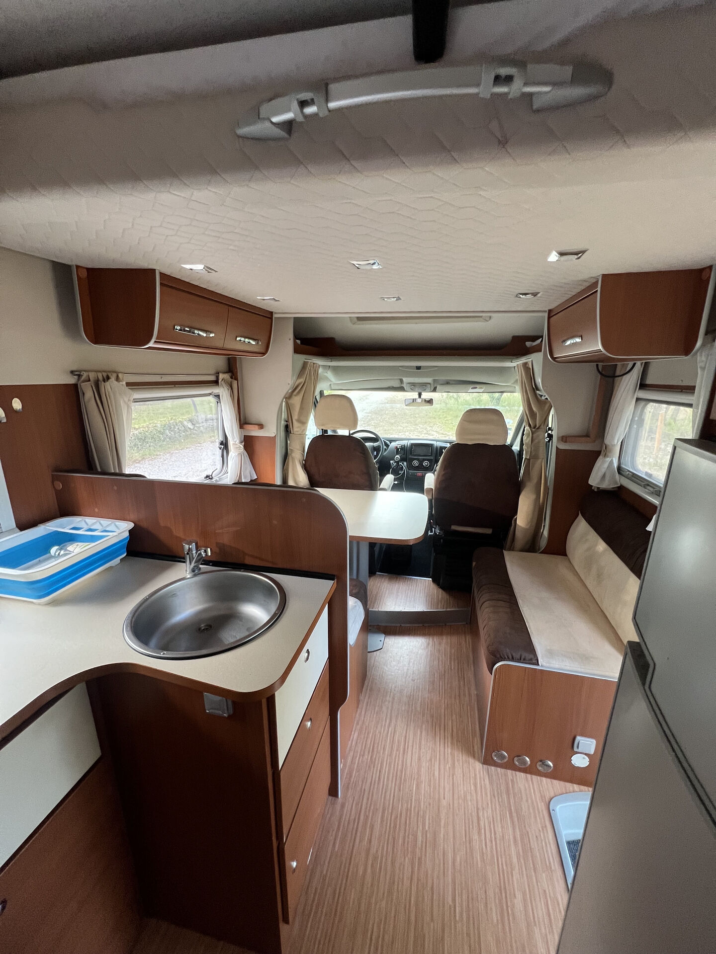 Aménagé pour 4 personnes, il offre un excellent confort de voyage avec lit pavillon + lits jumeaux, salon en L, cuisine équipée (évier, plaques gaz, réfrigérateur/congélateur), salle de douche avec WC, nombreux rangements, penderie et soute à bagages.