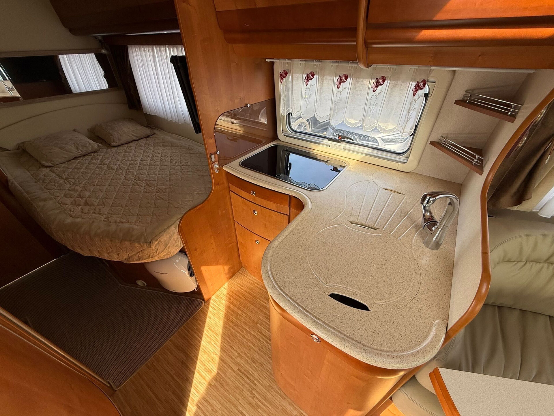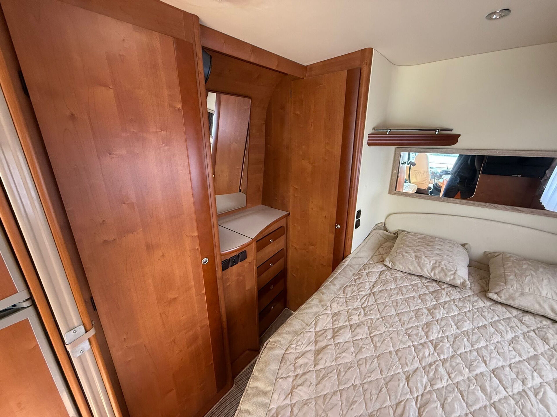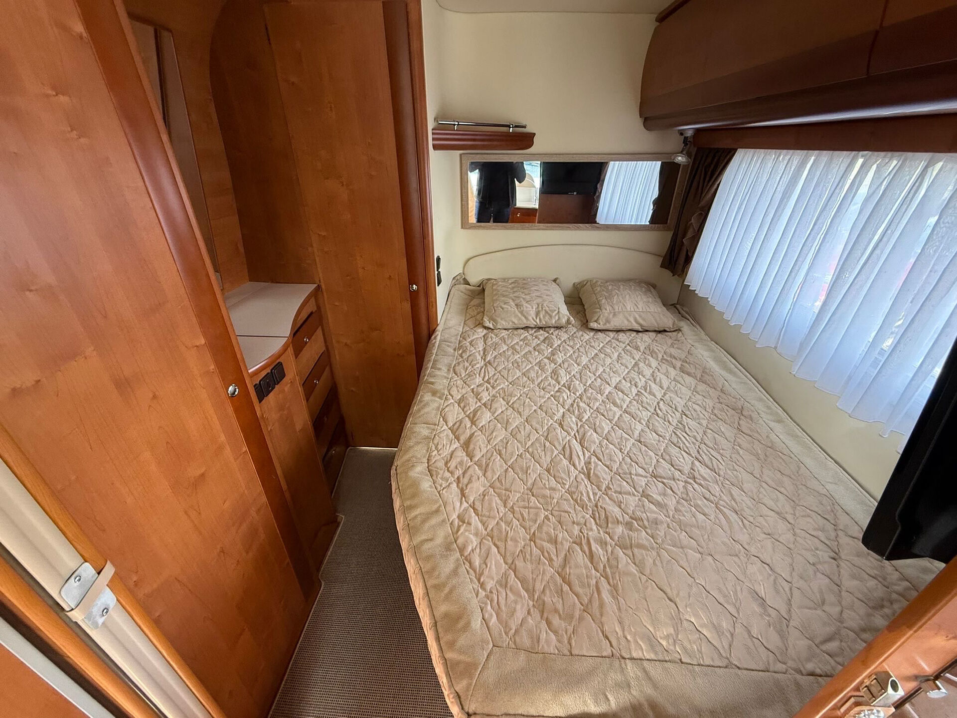 Camping-car très bien équipé pour les voyages : panneaux solaires, parabole automatique, antenne VHF et Cibi, store extérieur 5 m, porte-vélos 3 places avec coffre, caméra de recul neuve, climatisation cabine, ventilation cellule, intérieur cuir beige, frigo avec congélateur, four, plaque gaz, TV intégrée, salle de douche avec grande cabine arrière, moustiquaires et stores occultants. Également équipé d’un transformateur 12V / 220V, gaz propane avec deux bouteilles et nombreux rangements.