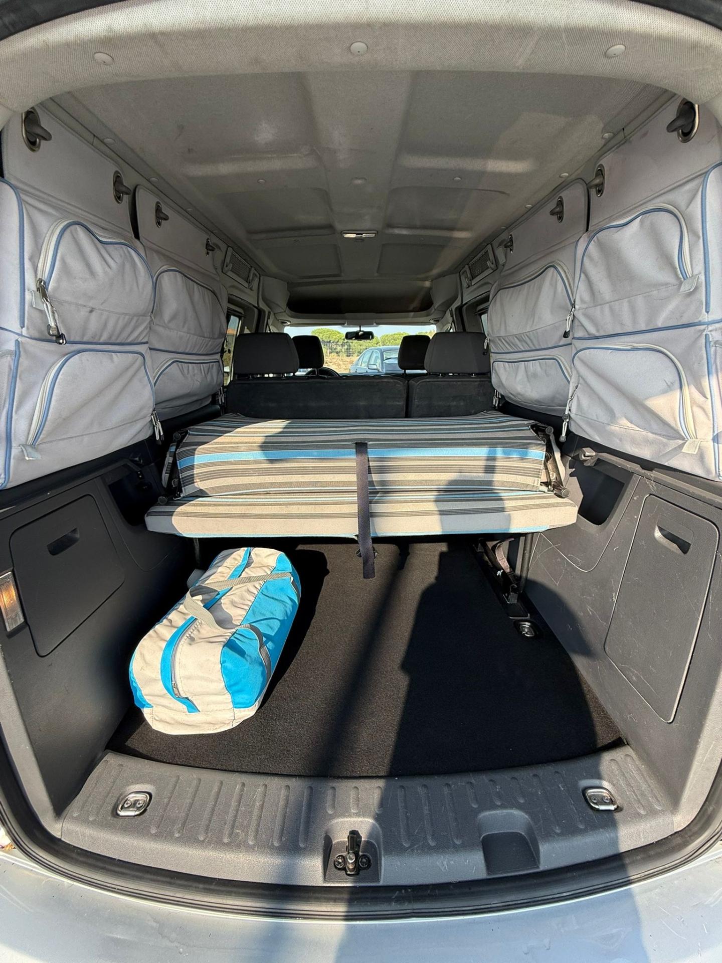 climatisation, prise 12V et prise AUX, ordinateur de bord, rétroviseurs électriques dégivrants, attelage, deux portes latérales coulissantes, 5 places, lit 2 personnes d’origine, volant multifonctions, hayon arrière, vitres électriques, sellerie tissu, jantes aluminium, régulateur de vitesse, vitres teintées, barres de toit.